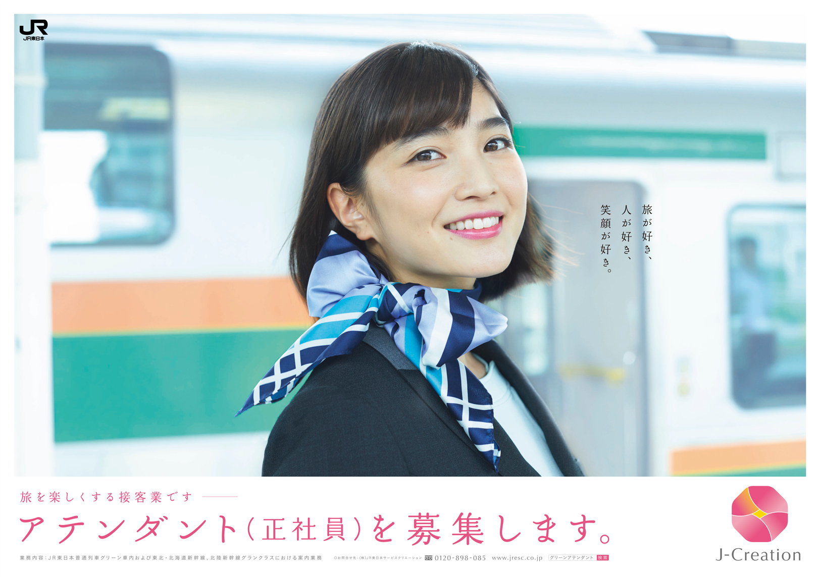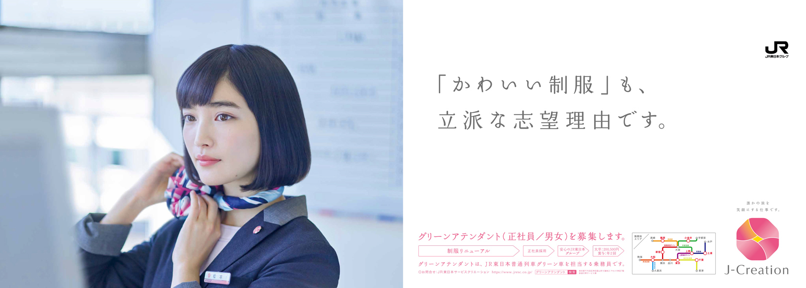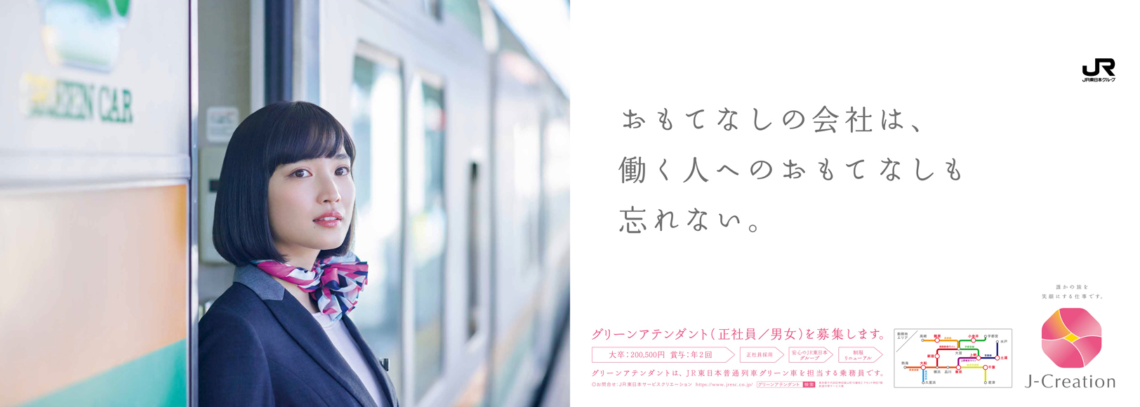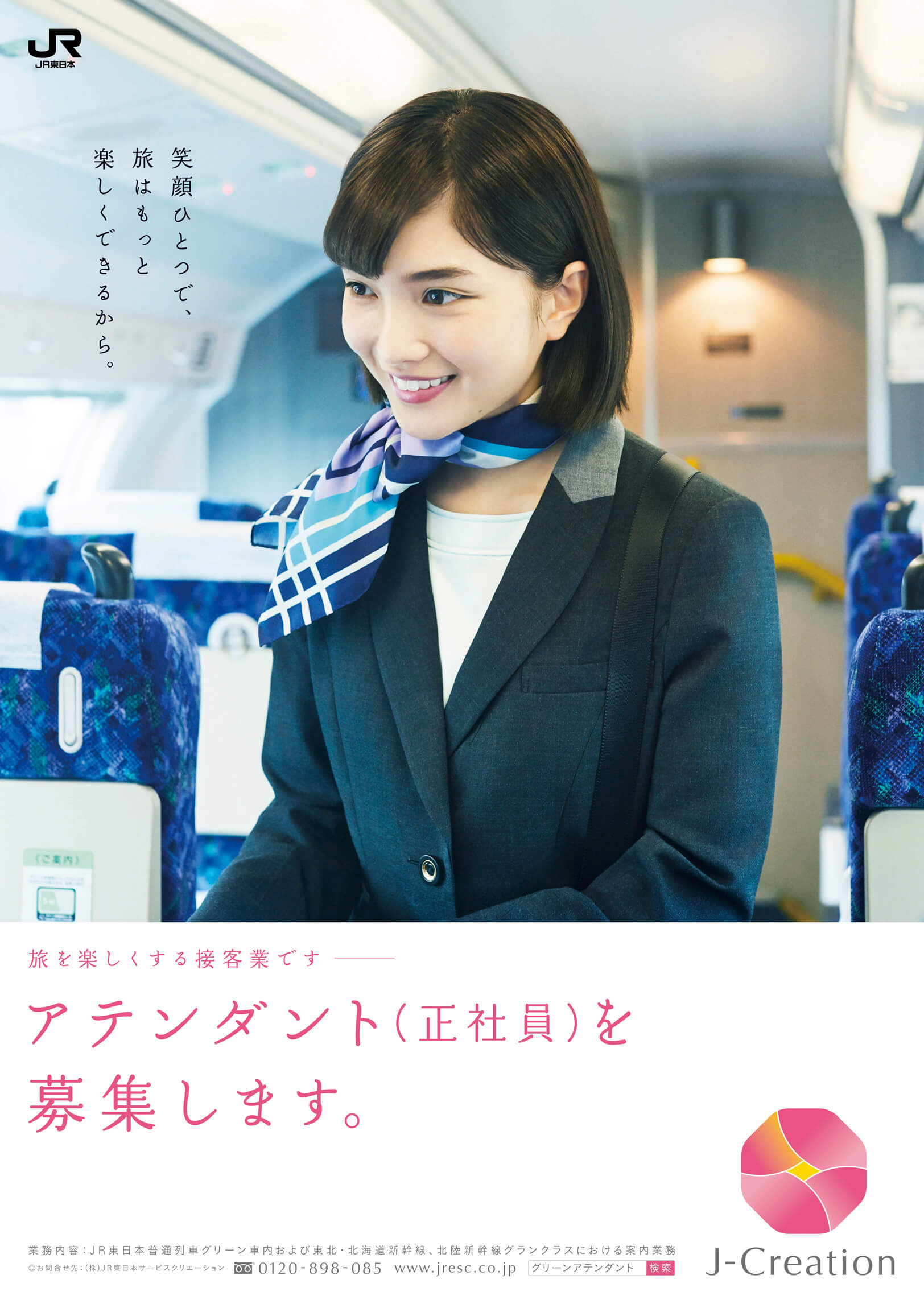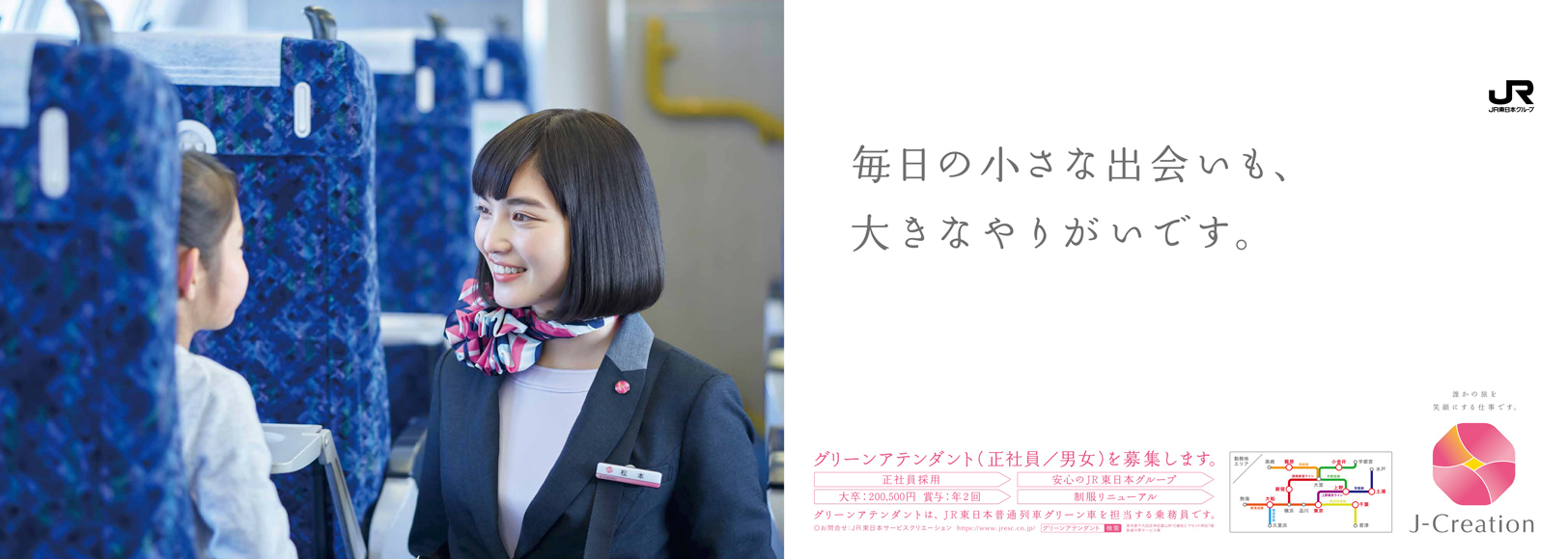アテンダント募集ムービー 働くグリーンアテンダント編(30秒バージョン) 誰かの旅を笑顔にする仕事です。 働くグリーンアテンダント編(15秒バージョン) 誰かの旅を笑顔にする仕事です。 踊るグリーンアテンダント編(30秒バージョン) 旅に笑顔を。 踊るグリーンアテンダント編(15秒バージョン) 旅に笑顔を。 アテンダント募集ポスター グリーンアテンダント募集2020年3月編① あなたの笑顔ではじまる、いい旅がある。 グリーンアテンダント募集2020年3月編② あなたの笑顔がグリーン車の顔になる。 グリーンアテンダント募集2020年3月編 電車内ポスター① あなたの笑顔ではじまる、いい旅がある。 グリーンアテンダント募集2020年3月編 電車内ポスター② 正社員という安心感も、働きやすさのひとつです。 グリーンアテンダント募集2020年3月編 電車内ポスター③ おもてなしの会社は、 働く人へのおもてなしも 忘れない。 グリーンアテンダント募集2020年3月編 電車内ポスター④ 毎日の小さな出会いも、大きなやりがいです。 グリーンアテンダント募集2020年3月編 電車内ポスター⑤ 「かわいい制服」も、 立派な志望理由です。 グリーンアテンダント募集2020年3月編 電車内ポスター⑥ あなたの笑顔がグリーン車の顔になる。 グリーンアテンダント募集2019年11月編 あなたの笑顔がグリーン車の顔になる。 グリーンアテンダント募集2019年10月編 笑顔ひとつで、旅はもっと楽しくできるから。 グリーンアテンダント募集2019年8月編 新しい制服で、新しいあなたをはじめませんか。 グリーンアテンダント募集2019年7月編 あなたの笑顔ではじまる、いい旅がある。